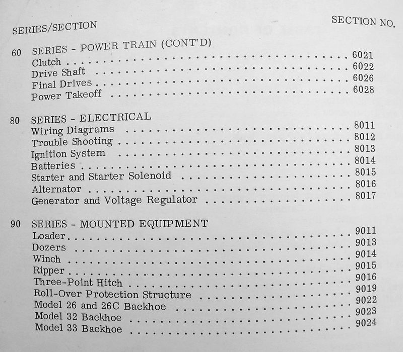 - Detailed sections on winch 9, 26 and 26C backhoes, 32 backhoe, and 33 backhoe.