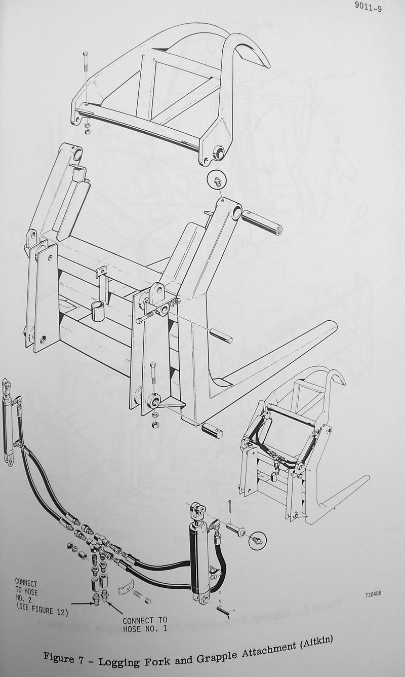 - Servicing instructions for various attachments including logging fork, grapple, 4-in-1 bucket, Ulrich bucket, and Drott hydraulics.