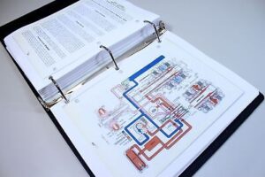 New reproduction manuals with all available Colored Pages and Charts included such as hydraulic flow charts, electrical schematics and possibly more depending on the application.
