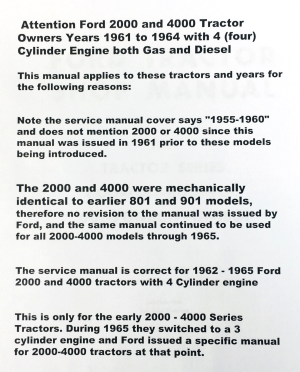 | Service/Repair Manual | Correct for Ford 2000 and 4000 tractors 1962-1965 with four-cylinder engines |