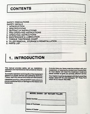 - Comprehensive coverage of the Kubota G4000 Rotary Tiller including maintenance tips and detailed operational instructions.