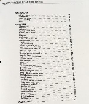 This Minneapolis Moline 5 Star Diesel Tractor Operators Manual is a comprehensive guide designed to help owners and operators maintain their tractors in optimal condition. Featuring clear instructions and detailed illustrations, this manual is essential for understanding the full capabilities and functions of your 5 Star model tractor. It is a practical resource for ensuring the longevity and reliable performance of your machine through proper maintenance and operation.