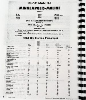 This comprehensive Minneapolis Moline G705 G706 Tractor Service Parts Manual Set is essential for operators and mechanics seeking to maintain, operate, and repair their tractors efficiently.This manual set provides detailed information and parts listings, ensuring you can keep your equipment in peak condition with confidence. It’s perfect for owners who prefer to handle maintenance and repairs themselves or professionals looking for accurate OEM documentation.